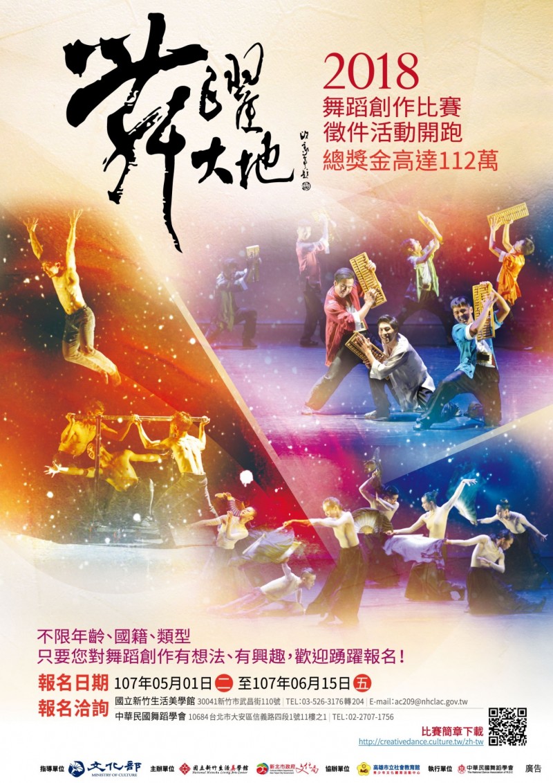 2018「舞躍大地舞蹈創作比賽」報名時間至6月15日止。參賽作品不限舞蹈種類,惟須以藝術舞蹈創作為目的,且須為未曾得過全國性以上公開比賽得獎之作品。舞者人數3至20人,初選影片以3分鐘精華影片為主,決選舞蹈長度以10分鐘以內為限。參賽者採線上(至主辦單位「舞躍大地」主題網站填寫線上報名資料)或紙本(以A4信封掛號郵寄或親至國立新竹生活美學館送件報名)兩種方式報名,經資格審核通過後進入初選。決賽將以現場演出方式評選出金牌獎1名20萬、銀牌獎1名16萬、銅牌獎1名12萬、優選5名各10萬、佳作7名。