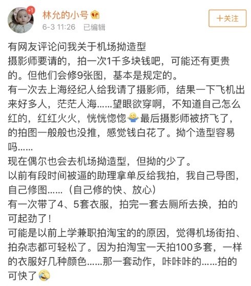 林允還自爆過去曾逼助理拿單眼幫她拍,她再親自導圖及修圖,有一次更帶了4、5套衣服,拍完一套再去廁所換,她一針見血的戳破「機場時尚」的假象,讓粉絲直呼「像林允這麼誠實的藝人不多了」、「這麼老實可以嗎」。