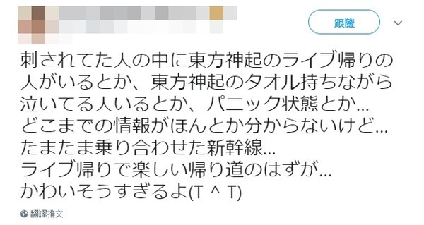 據日媒報導,事件發生於東京開往新大阪的東海道新幹線希望號265號列車,當時「東方神起」演唱會結束,許多粉絲心滿意足搭上新幹線返家,不料卻見一名男子手拿開山刀「無差別」攻擊乘客,3名乘客閃避不及被砍傷,其中一名30歲男性更因被砍中脖頸附近,緊急送醫仍宣告不治。