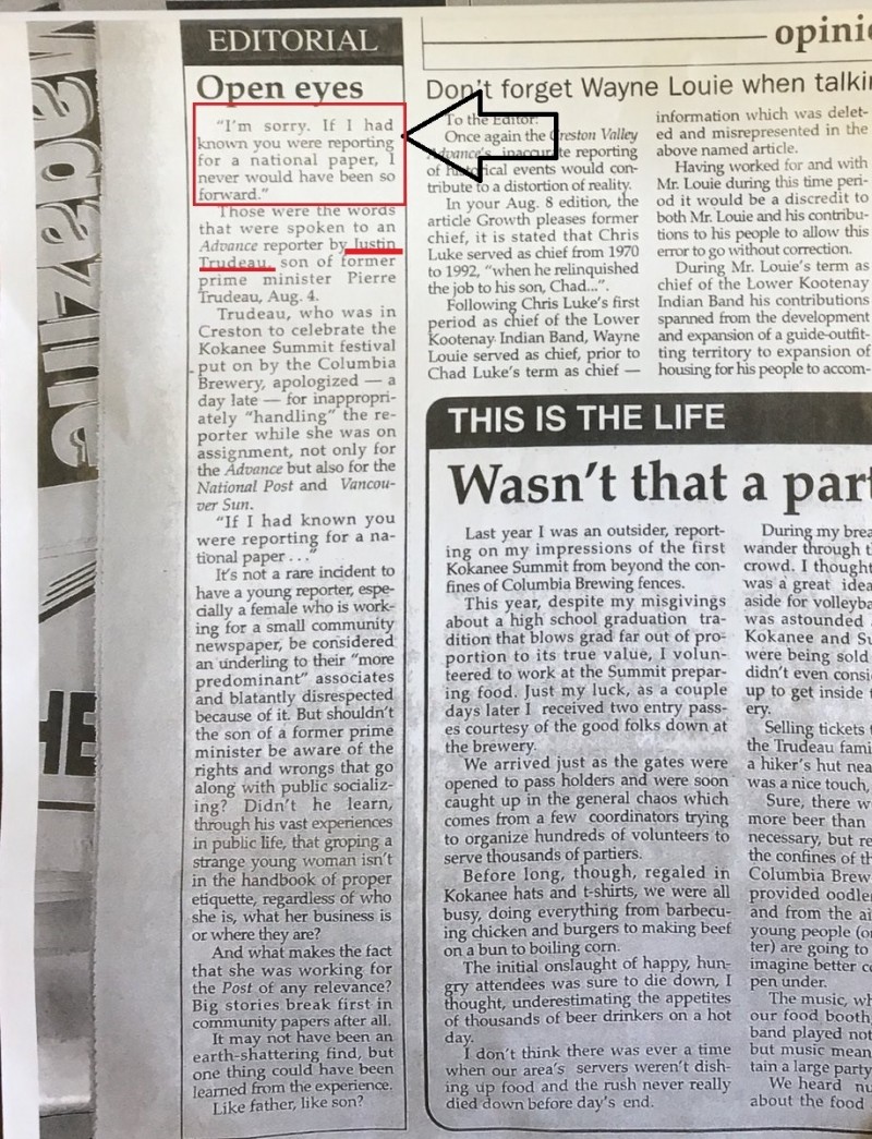 報導指,杜魯道在2000年於克雷斯顿音樂會上,對一名女記者毛手毛腳,但當得知對方的媒體從業人員身分後,擔心影響政壇未來,趕緊道歉:「若知道她是一份全國性報章雜誌記者,就不會這麼做。」