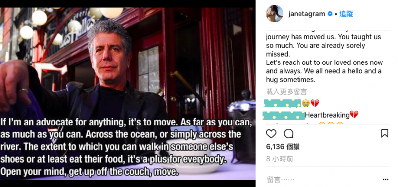 波登的名言寫道:「Travel isn’t always pretty. It isn’t always comfortable. Sometimes it hurts, it even breaks your heart. But that’s okay. The journey changes you; it should change you... You take something with you. Hopefully, you leave something good behind.(旅行並不總是美好的,它也不總是舒服的。有時候會傷人甚至讓你心碎。但那無妨,因為旅程會改變你,它應該改變你,你帶走一些東西,希望妳留下一些好的東西。)」Janet接著寫出自己對波登的思念,呼籲網友都要多跟親人們聯絡,送上一個問候或是個擁抱。