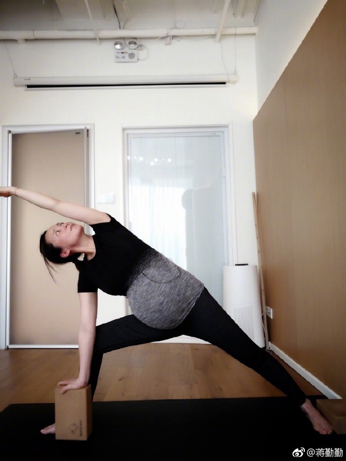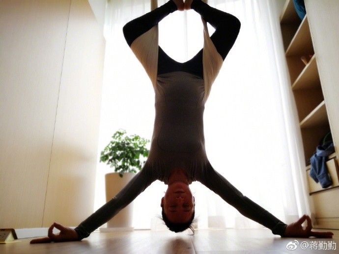 今年42歲的蔣勤勤身材保養得宜,即使懷孕也不敢怠慢,仍努力的鍛鍊身體,她穿上深色運動衣,孕肚已經相當明顯,而她做的可不是一般的瑜珈動作,只見她用繩帶纏住下半身,整個人變成頭朝地的倒立姿勢,從她滿頭大汗的模樣可看出有多麼費力。蔣勤勤也分享她對瑜珈的看法,表示「做每個體式的背後,讓我們感受到前屈的謙卑、扭轉的釋懷、站式的力量、倒立的勇氣,還有平衡的鎮定」。