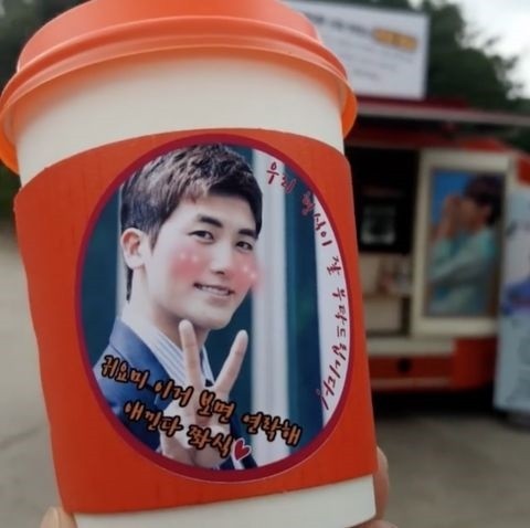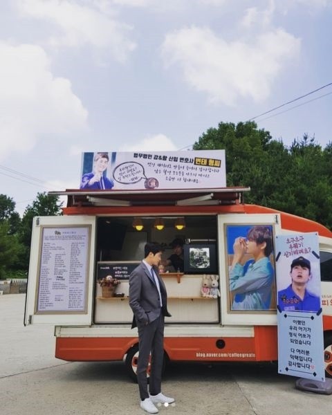 上回收到應援餐車的是拍攝《金秘書為何那樣》的朴敘俊,當時V在餐車橫幅寫的是:因為朴敘俊大家都辛苦了,就當是給討厭的傢伙多加上一個反光板吧,不管怎樣,拜託大家了!