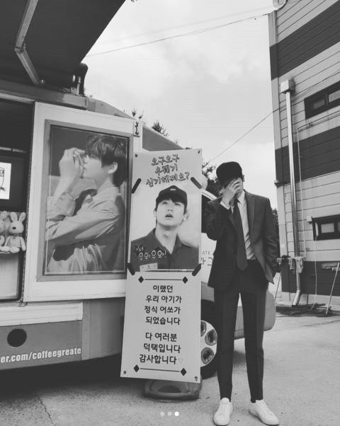 貼心的V在送給朴炯植的餐車看板上寫著:「哎喲哎喲!我們寶寶覺得很神奇嗎?我們寶寶這裡成為了正式律師,托大家的福,謝謝。」杯子的貼紙也有寫著:請多多關照我們炯植,小可愛看到的話跟我聯絡。