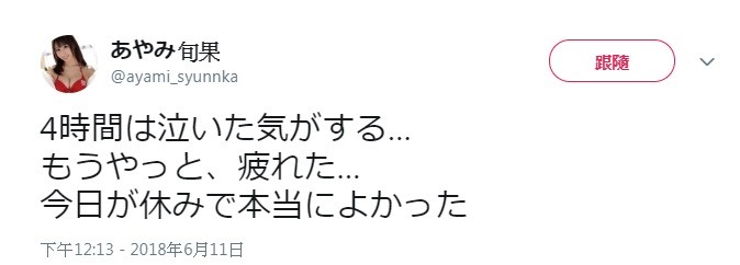 上月知名片商蚊香社遭到駭客入侵,導致上百部無碼母帶流出,彩美旬果、鈴村愛里、長谷川留衣等人都成為受害者。昨(11)彩美旬果突然在推特發文透露「哭了4個小時真的好累,幸好今天是休假日」,雖然沒有說明原因,但外界都認為她是因影片外流而情緒潰堤。