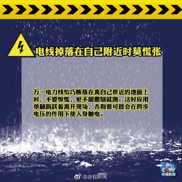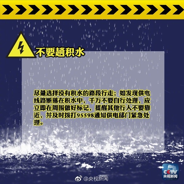 央視PO圖說「不要蹚積水」,文中要民眾盡量選擇沒有積水的路段行走,「電線斷落在水中不要處理,不要驚慌,應用單腿跳著離開現場,否則可能會觸電身亡」,此外也提醒民眾別在變壓器底下躲暴雨。