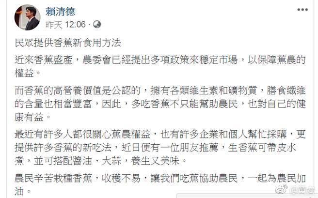 〔娛樂頻道/綜合報導〕行政院長賴清德昨呼籲,「香蕉價格1公斤只有1元」證實是假新聞,他建議民眾可嘗試把香蕉皮水煮沾醬油、大蒜吃,不但養生也美味,一心想替蕉農解決滯銷問題,「台獨剋星」黃安卻忙著扯後腿。